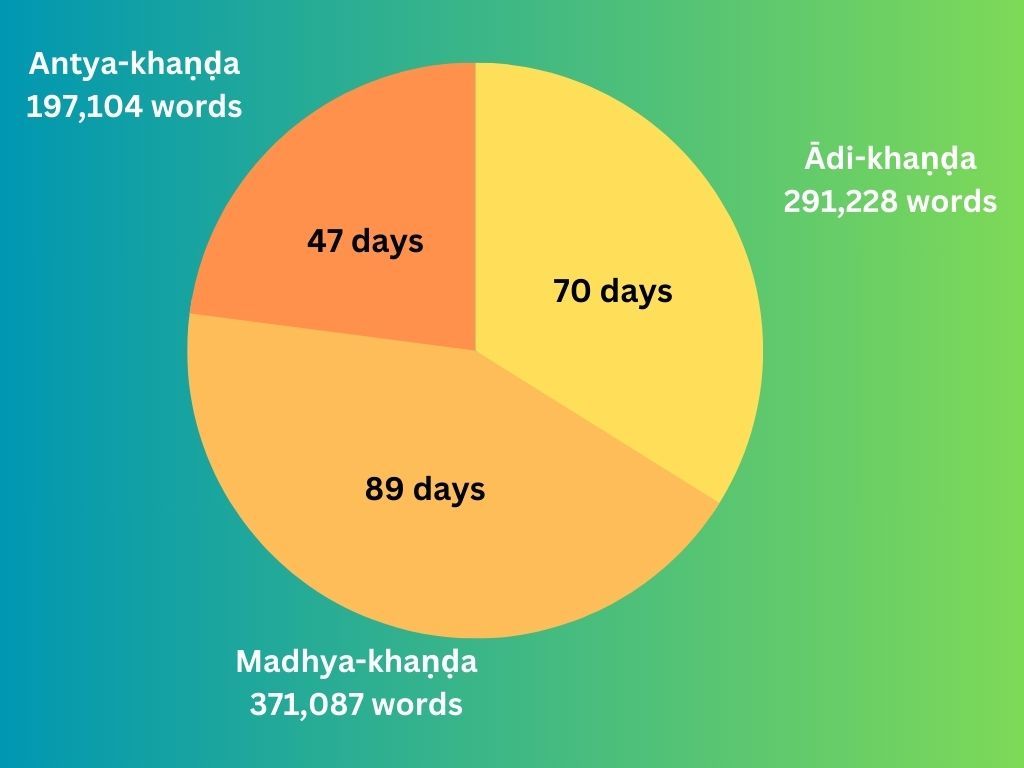 It took us 70 days to complete the Ādi-khaṇḍa of Śrī Caitanya-bhāgavata. Following the same pace, we'd need 89 days for the Madhya-khaṇḍa, 47 days for the Antya-khaṇḍa, and 7 days for the summaries, totaling 143 days. If read without missing a single day, we'd finish Caitanya-bhāgavata on March 5, 2024.