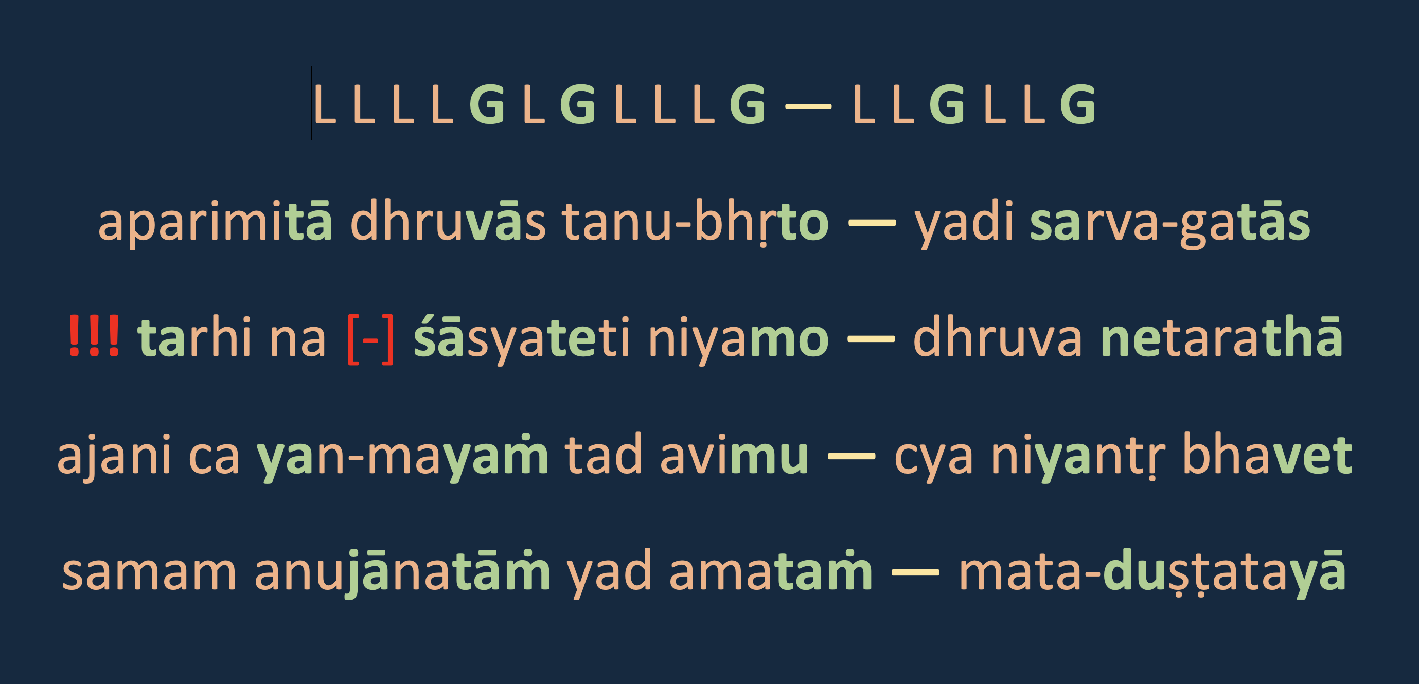 I also went over Sanskrit verse meter in the above video. Here's a screen shot of the above verse divided according to laghus and gurus. Find out more below.